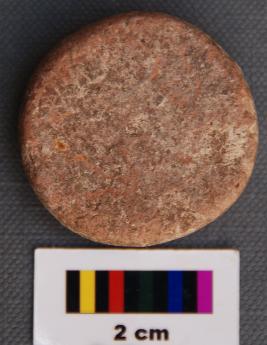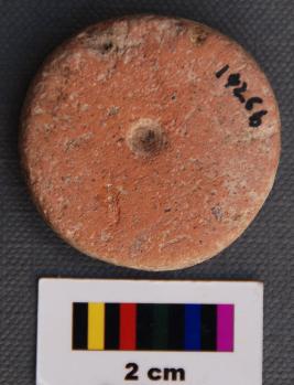 | Description / विवरण | It is a perfactly circular terracotta disc, in which perforation is attemted. It may have been fragment of a pot as treated with red wash on one side. |
