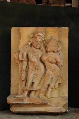 | Description / विवरण | Fragment of a temple wall presents the figure of Uma-Mahesvara which are in very damaged condition. Most of their hands are broken. Both of them have flung one of their hands behind each other neck. |