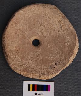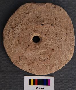 | Description / विवरण | It is perforated circular terracotta disc. The preforation has grinding marks on either side indicating that it may have been used. |