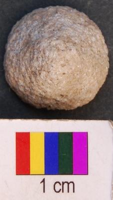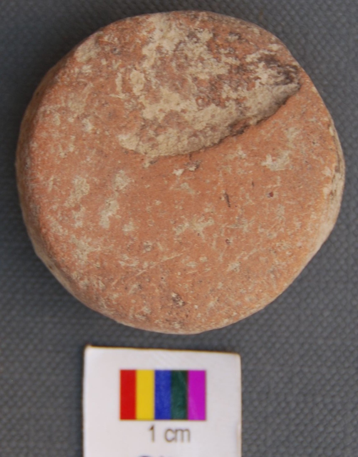 It is a terracotta disc, which is thick in section. Its thickness is uneven.