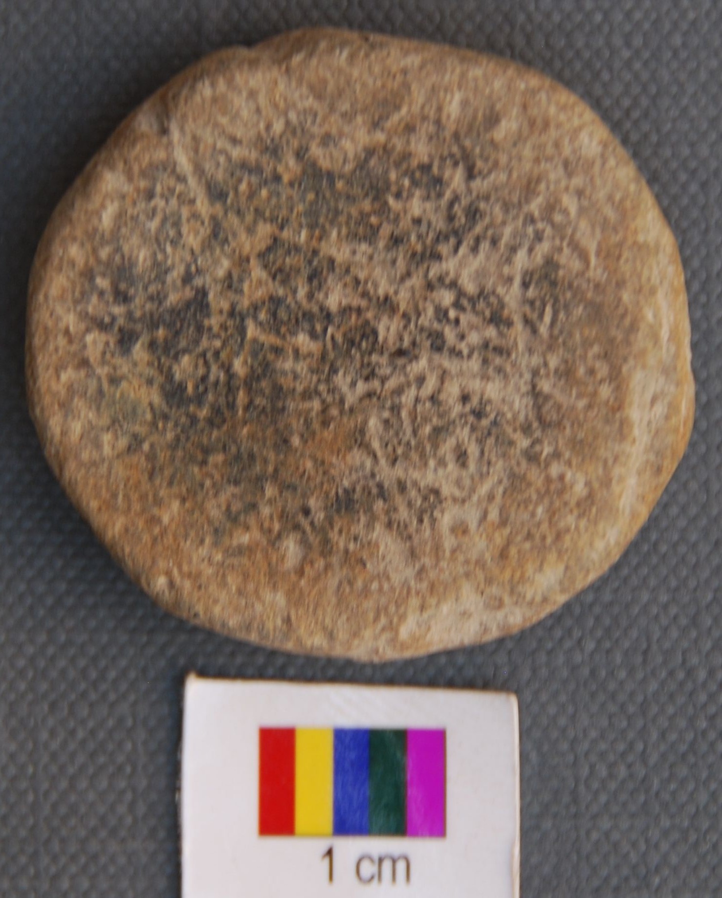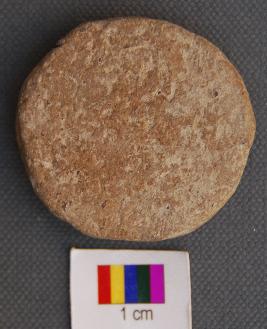 It is a terracotta disc with grass marks on one side.