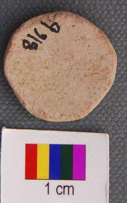 | Description / विवरण | It is a small disc like tablet. It has red slip on one side and has thin section. It may have been used as gamesman. |