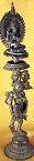 | Description / विवरण | This sculpture made of two components fitted one above the other. The lower part represents a alasa-kanya standing agaist a tree, above which is a full-blown lotus with a centra bowl like depression inside and a conical projection. The conical projection is supported the four-armed image. The Nayika is tall and slim with her full and prominent bust and a pellet on the forehead is dressed a long folded uttariya, which encircling her back and upper arms with girdle. She is wearing anklets, bangles, armlets, necklace, ear-rings, and a crown at the head. She is busy with her hands in taking out her anklets from her raised right foot perched on the trunk of the tree. Above it conical projection, the four-armed and three-eyed Bhrikuti is seated in paryankasana pose on a lotus pedestal. His major hands are in anjali mudra placed near the chest and upper right and left bears rosary and a staff respectively. Behind the image, there is a circular halo with leaf designed margin . On the back side of the halo,there is an inscription. |