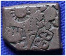 | Description / विवरण | The shape of the coin is roughly rectangular. One corner is chipped. Obverse Sun, six armed, caduceus, animal and other symbol is indistinct. Reverse Caduceus and other symbols are minute. |