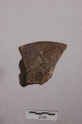 | Description / विवरण | Fragment of stone disc. The convex upper surface is decorated with six-petaled geometrical flowers filled with granules. The disc |