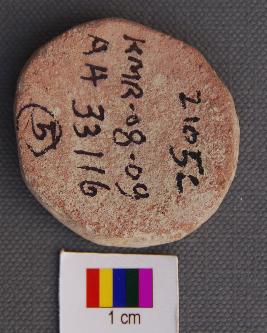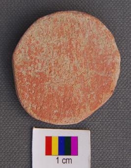 | Description / विवरण | It is a circular terracotta disc with thin section. It has red slip on one side. |