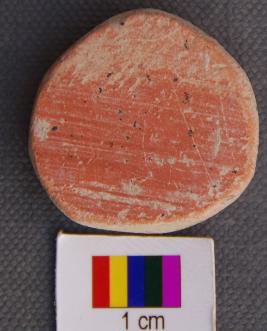 | Description / विवरण | It is a perfactly circular terracotta disc with grind edges. It is made of a Harappan pot sherd and has red slip on one side. |