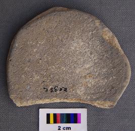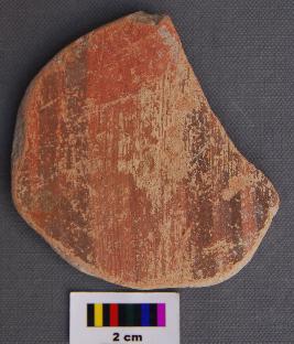 | Description / विवरण | It is a large terracotta disc with black painting on red slip on one side. It has thin section. It is paratilly broken. |