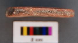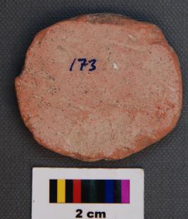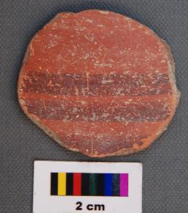 | Description / विवरण | It is a terracotta circular disc with irregular edges. It is perhaps made of Historic Red Ware. It has been treated with red slip and band of black painings on one side. |