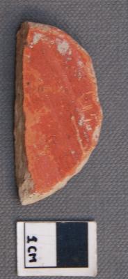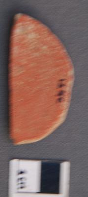 | Description / विवरण | It is a fragment of a terracotta disc with red slipped on one side. Its half portion is missing. |