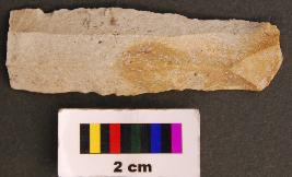 | Description / विवरण | It is a long parallel sided blade with retouch on both sides. It has a thick section. Its distal part is missing. |