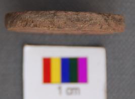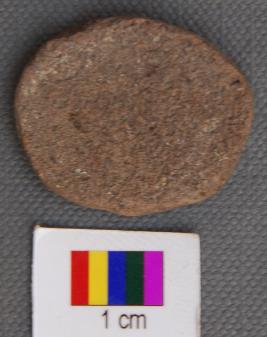 | Description / विवरण | It is a small oval shaped terracotta disc with grind edges. It has thin section and has red slip on one side. |