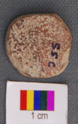 | Description / विवरण | It is a small terracotta disc with partially grind edges and looks like a tablet. It has thin section and made of red ware pot sherd. |