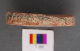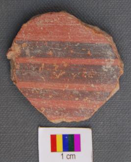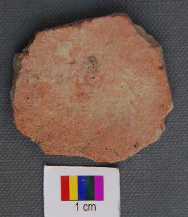 | Description / विवरण | It is a terracotta disc with rough edges. It is made of red slipped ware pot sherd.On the red slip is a band of black painting. |