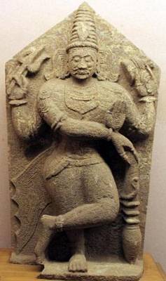 | Description / विवरण | The right leg of the sculpture erects on a plain slab a crossing with left leg. He has four hands. The right principal hand holds Gada rounding a snake and the left principal hand is in Abhaya mudra. His right additional hand holds Trisula and left hand holds Dambaru. His Facial expression shows as a grave position. His hairs are in Jatamukuta style and the snake is in middle portion of the Jatamukuta. |