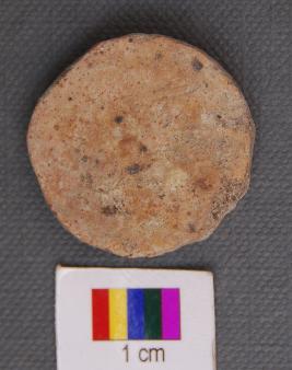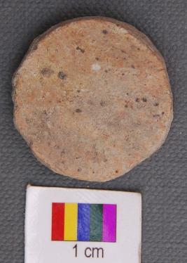 | Description / विवरण | It is a small circular terracotta disc with grind edges. It has a shallow depression and made of red ware pot sherd. |