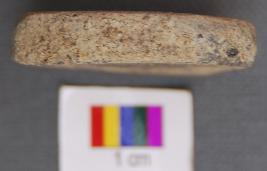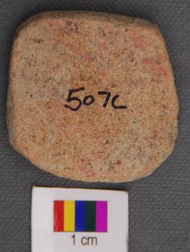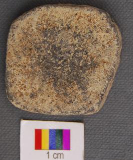 | Description / विवरण | It is a small squarish terracotta disc with grind edges. It is made of red ware pot sherd and has black patch on one side. |
