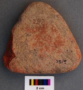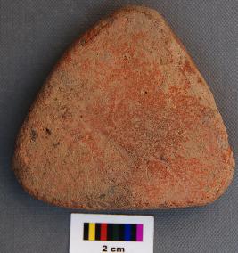| Description / विवरण | It is a triangular terracotta cake which is thick in section and partially broken at one of the corners. |