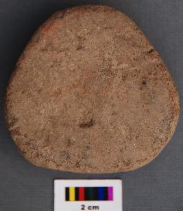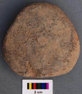 | Description / विवरण | It is a triangular terracotta cake with thick section and blunt corners. It is partially broken and looks almost circular. |