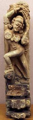 | Description / विवरण | The image is standing in three tyres pedestal in tribhang pose.It has two hands, holding the branches of the Tree. The breast and Face portion of this figure is broken. She adorned with Earring, Griddle, necklace, armlet, waist band, anklet mathamani and drapory. |