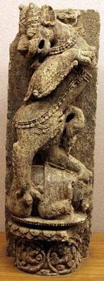 | Description / विवरण | The sculpture Gajasimha is standing on the decorative lotus pedestal. The frieze is made of human figures a rampart lion with head swing back wards, springing over either a crounching elephant. This image adorned with iron belt on neck and another belt lying from chest to buttock. Lion has long tounge. |
