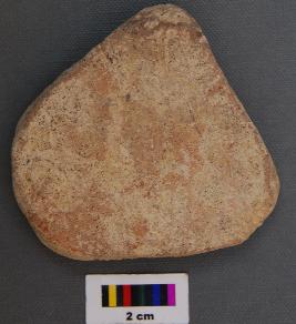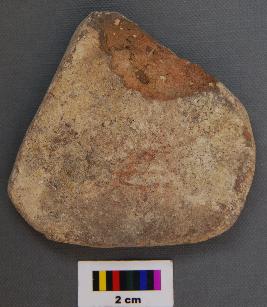 | Description / विवरण | It is a triangular terracotta cake with blunt corners. It is partially broken and has uneven thickness. |