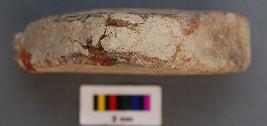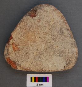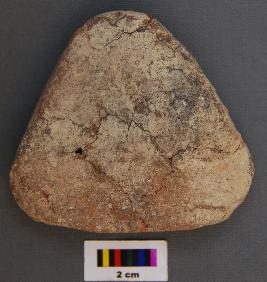 | Description / विवरण | It is a triangular terracotta cake with uneven thickness and blunt corners. It is partially broken at the edges. |