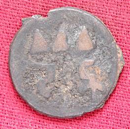 | Description / विवरण | The shape of the coin is circular. Obverse Probably the figure of MAO or Moon-God with right hand curved upwards and the crescent above the left shoulder. Reverse Three hills or cone like objects placed in a straight line and below, there is inscription. |