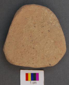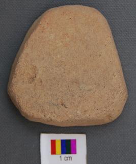 | Description / विवरण | It is a small triangular terracotta cake with blunt corners. It is partially broken and has uneven thickness. |