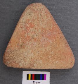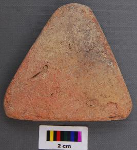 | Description / विवरण | It is a triangular terracotta cake with thin section and blunt corners. It is partially broken and has uneven thickness. |
