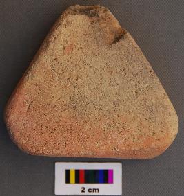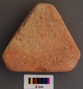 | Description / विवरण | It is a triangular terracotta cake with blunt corners. It is partially broken at one end of the coerners. |