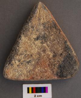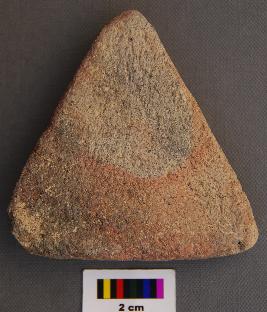 | Description / विवरण | It is a triangular terracotta cake with angular corners. It is partially broken at one end.. |