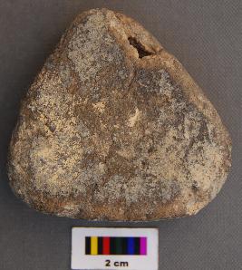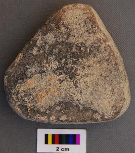 | Description / विवरण | It is a triangular terracotta cake with thick section and blunt corners. It is partially broken and has uneven thickness. |