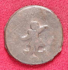 | Description / विवरण | The shape of the coin is circular. Obverse Kushana type king, standing with his right hand curved upwards and his left hand extended. Reverse Probably the figure of MAO or Moon-God with his right hand curved upwards and the crescent above the left shoulder. |