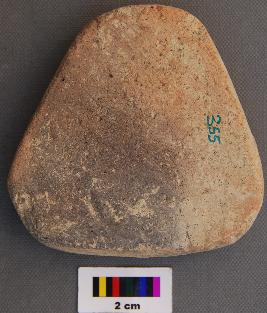 | Description / विवरण | It is a triangular terracotta cake with blunt corners. It has uneven thickness. It is over fired. |