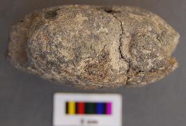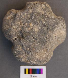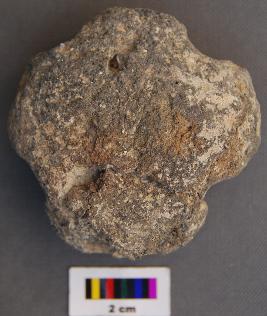 | Description / विवरण | It is a small circular terracotta cake with thick section and blunt edges. It is partially broken and has uneven thickness. It has four depressions on the periphery, in which fingers fit well. It is dark greyish or blakish in appearance. |