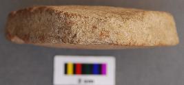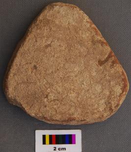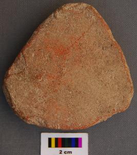 | Description / विवरण | It is a triangular terracotta cake with blunt corners. It is partially broken at one end and has uneven thickness. |