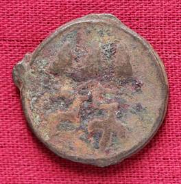 | Description / विवरण | The shape of the coin is circular. Obverse Probably the figure of MAO or Moon God with right hand curved upwards and the crescent above the left shoulder. Reverse Three hills or cone like object place in a straight line and below them there is inscription. |