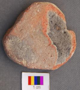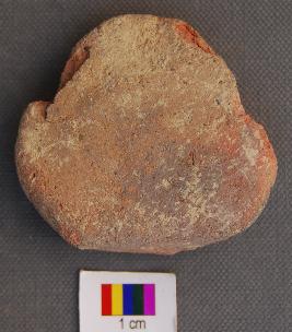 | Description / विवरण | It is a small triangular terracotta cake with round corners. It is partially broken and has uneven thickness. |