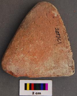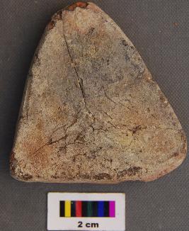 | Description / विवरण | It is a triangular terracotta cake which is over burnt. Cracks are developing on one side. |