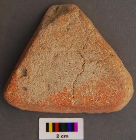 | Description / विवरण | It is a triangular terracotta cake with thick section. It is partially broken at one corner. |