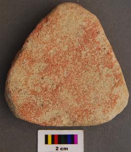 | Description / विवरण | It is a triangular terracotta cake with blunt corners. It has batter marks on one side. |