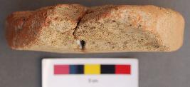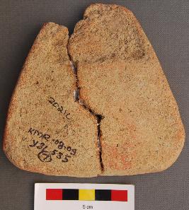 | Description / विवरण | It is a large triangular terracotta cake with blunt corners. It is partially broken at one end. In fact it was broken in two pieces and refitted. |