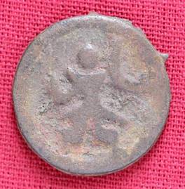 | Description / विवरण | The shape of the coin is circular. Obverse Kushana type king, standing with his right hand curved upwards and the crescent above the left shoulder. Reverse Probably the figure of MAO or Moon-God with his right hand curved upwards and the crescent above the left shoulder. |