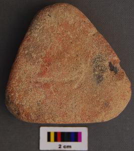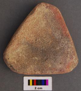 | Description / विवरण | It is a triangular terracotta cake with blunt corners. It has thick section and black patch on one side. |
