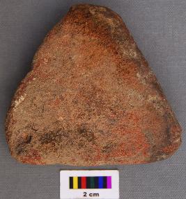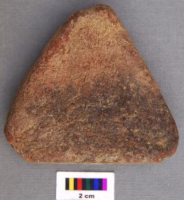 | Description / विवरण | It is a triangular terracotta cake with blunt corners and black burnt patches. |
