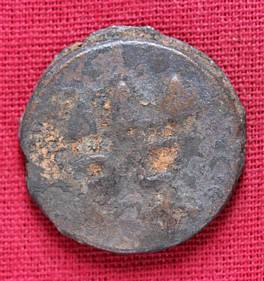 | Description / विवरण | The shape of the coin is circular. Obverse Probably the figure of MAO or Moon God with right hand slightly curved upwards and the crescent above the left shoulder. Reverse Three hills or cone like objects placed in a straight line and below them there is inscription. |
