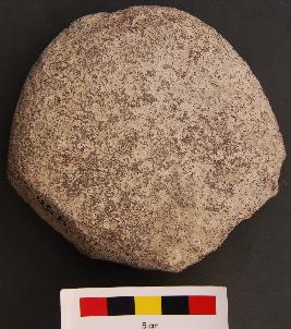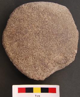 | Description / विवरण | It is a large disc shape object with thick section, one of the faces of which are grind or polished. It was perhaps used as a muller. |