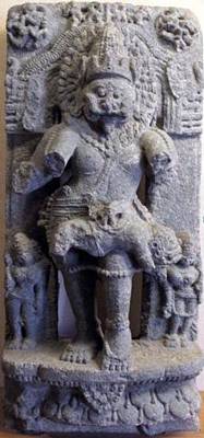 | Description / विवरण | It is the stauna-Narasimha image standing in tribhanga pose over a lotus pedestal it has four hands which are broken. Hiranyakasipu is stretched on the left thigh of Narasimha, who is in the tribhanga posture, and rips open the belly of the demon. His neck shows thick mane and curved teeth crowned by a mukuta and wears anklet, hara, necklace and girdle. His back pedestal is designed as a kirtimukha torana and flanked by flying Vidyadhara holding the garlands on both the hands. The image is flanked by two attendants holding a chauri in his right hands. |