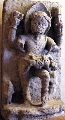 | Description / विवरण | Narasimha is one of the ten incarnations of Vishnu. Vishnu takes the form of half man and half lion to destroy the demon Hiranyakasipu. Narasimha images are of three types i Girija- Narasimha ii Sthauna- narasimha iii Yanaka-Narasimha , stands over a lotus pedestal. His upper right hand holds an indistinct object and the upper left hand holds a lotus stalk. Hiranyakasipu is stretched on the left thigh of Narasimha, who is in the tribhanga posture. With two hands he rips open the belly of the demon. On both sides of the image, there are attendants which are not clearly visible due to erosion. |